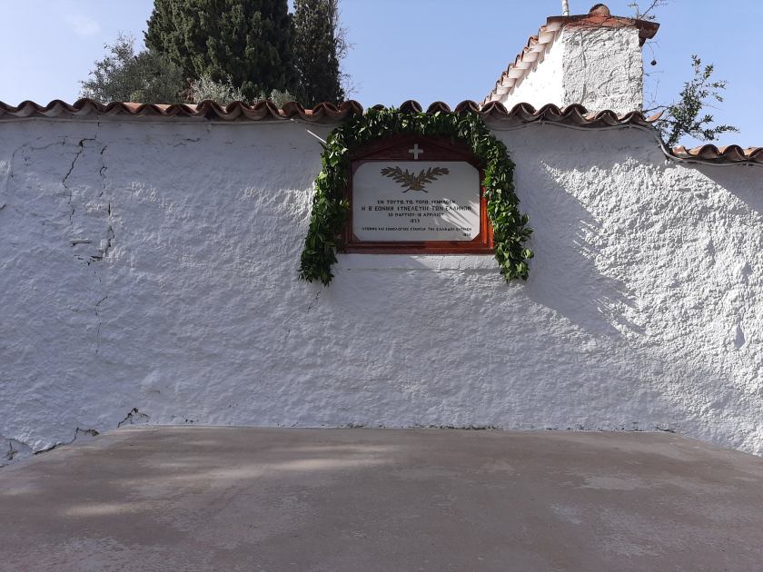 “Οι ραγιάδες πρόγονοι μας «τετρακόσια τόσα χρόνια ζούσανε στη καταφρόνια και ανάστασης ημέρα ….καρτερούσαν» τελικά, αποφασίσαν να διώξουν τους Τούρκους κατακτητές και εκείνες της πολύ δύσκολες και πολύ κρίσιμες στιγμές ,στη αρχή της επανάστασης, που όλα κρέμονταν από μια κλωστή , διάλεξαν το τόπο μας και αυτό το «ιερό χώρο»,για να συντονίσουν τις πολλές αντιμαχόμενες και αυθόρμητες προτάσεις όλων των αγωνιστών , να σχεδιάσουν τον αγώνα εναντίον των κατακτητών και το κτήσιμο του νεοσύστατου Ελληνικού κράτους.