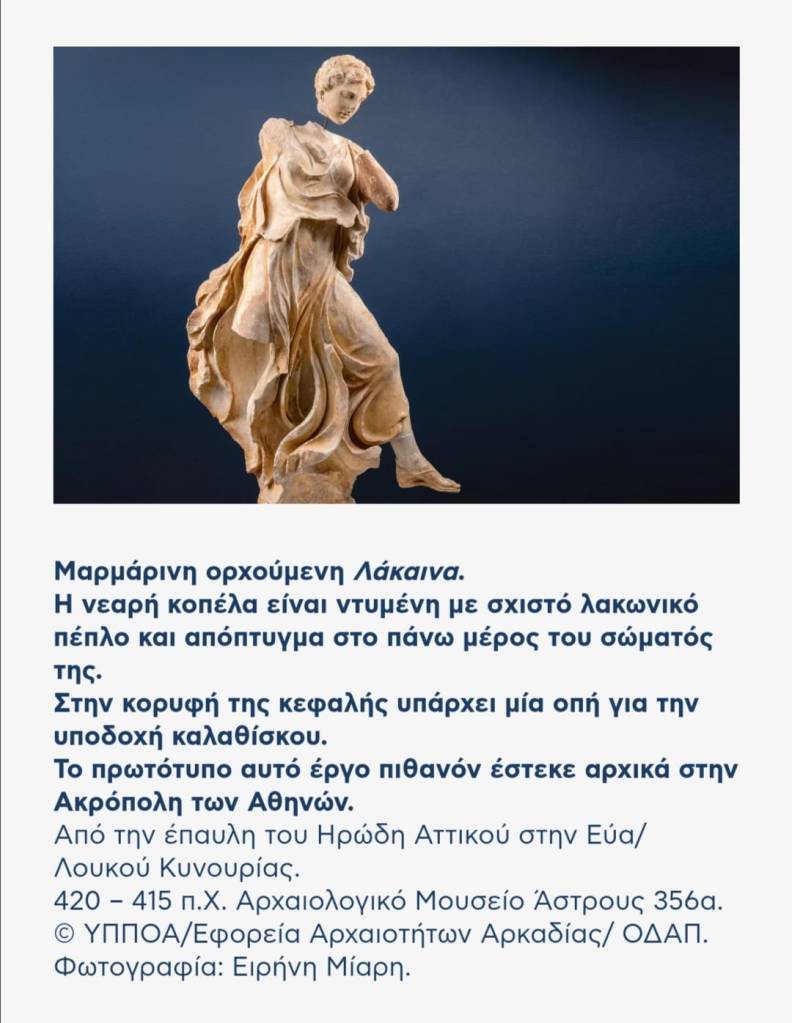 Η «Ορχούμενη Λάκαινα» , έργα του Καλλιμάχου του 5ου αι. π.Χ και βρισκόταν αρχικά στην Ακρόπολη των Αθηνών. Από εκεί, ο «συλλέκτης» έργων τέχνης η κλέπτης αρχαίων μνημείων προδότης και συνεργάτης των Ρωμαίων κατακτητών Ρωμαίος έπαρχος , μετέφερε αυτό το σπάνιας καλλιτεχνικής αξίας άγαλμα για να κοσμήσει την έπαυλή του στην Εύα Κυνουρίας.”ΑΠΟΦΑΣΙΖΟΥΜΕ ΚΑΙ ΔΙΑΤΑΣΣΟΥΜΕ ,διέθετε και Ρωμαϊκές λεγεώνες………..