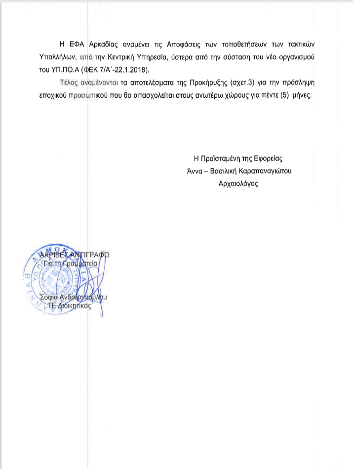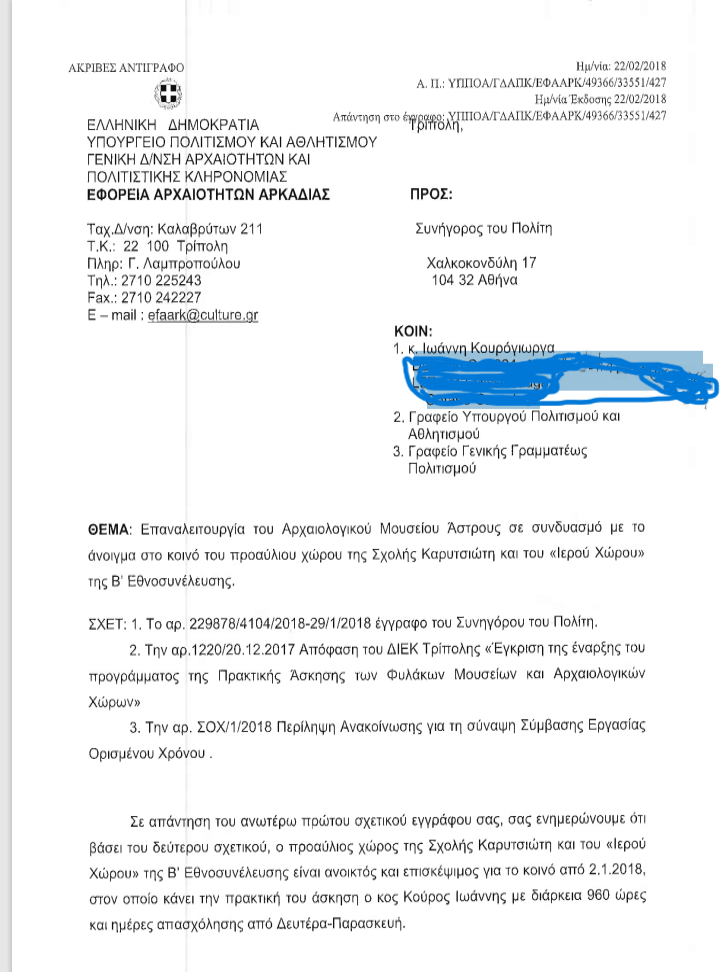5)Την 18-5-2018.… με το έγγραφο Α.Π. ΥΠΠΟA /ΓΔΑΠK /ΕΦΑAΡΚ /218494/158967/1928 …”Η Υπηρεσία μας έχει μεριμνήσει ώστε το Μουσείο να είναι ανοικτό σε συγκεκριμένες περιπτώσεις , διαθέτοντας τακτικό φυλακτικό προσωπικό από το Αρχαιολογικό Μουσείο Τεγέας .Σας επισυνάπτουμε Δελτίο Τύπου με συγκεκριμένες ημερομηνίες κατά τις οποίες το Αρχαιολογικό Μουσείο Άστρους θα είναι ανοικτό κατά τους μήνες Μάιο-Αύγουστο 2018. Τέλος η Εφορεία μας , αναμένει την Προκήρυξη του ΑΣΕΠ για μόνιμο φυλακτικό προσωπικό στο Μουσείο Άστρους”…..