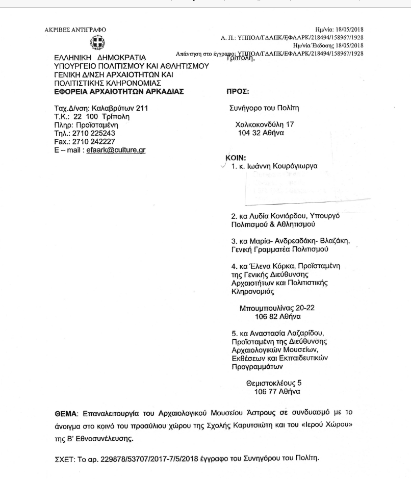 Το ΥΠΠΟΑ είχε κλείσει χωρίς απόφαση για δέκα χρόνια (2008-2018) , τον “Iερό Χώρο” της Εθνοσυνέλευσης και το Προαύλιο της Σχολήs Καρυτσιώτη και με απόφαση το 2008 το Αρχαιολογικό Μουσείο Άστρους για την πρόφαση της ρωγμής. Μετά από πολλά έγγραφα για δύο χρόνια τελικά επεκράτησε ο κοινός νους και το ΥΠΠΟΑ άνοιξε προσωρινά το 2018 το Αρχαιολογικό Μουσείο Άστρους , τον “Iερό Χώρο” της Εθνοσυνέλευσης και το Προαύλιο της Σχολήs Καρυτσιώτη και μας ειδοποίησε με τα παρακάτω έγγραφα.