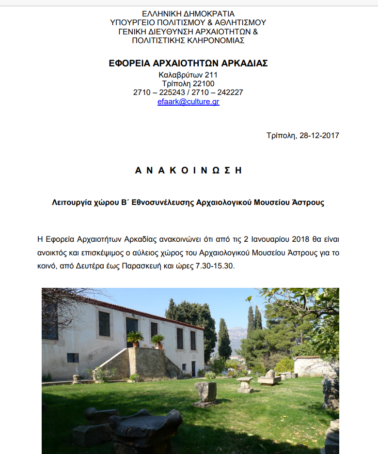 Θέμα: Επαναλειτουργία του Αρχαιολογικού Μουσείου Άστρους σε συνδυασμό με το άνοιγμα στο κοινό του προαύλιου χώρου της Σχολήs Καρυτσιώτη και του “Iερού Χώροςυ” της Β’ Εθνοσυνέλευσης