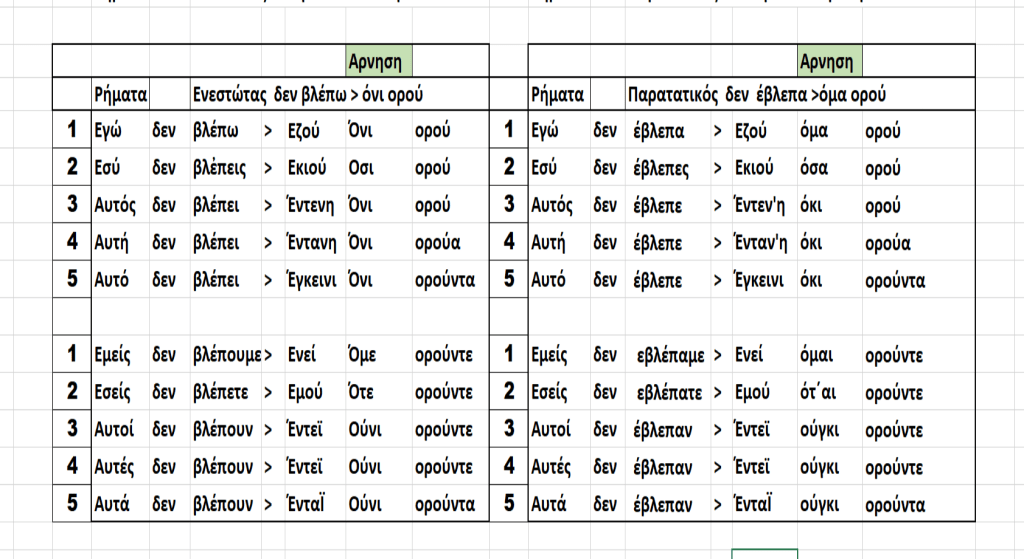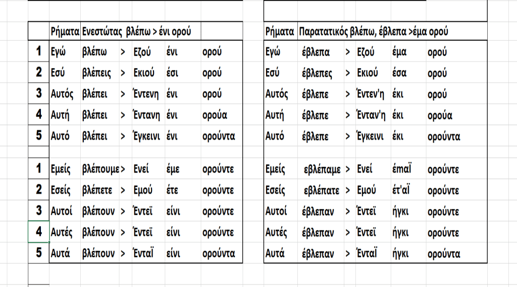 Ρήματα Ενεστώτας βλέπω > ένι ορού , Παρατατικός βλέπω, έβλεπα >έμα ορού