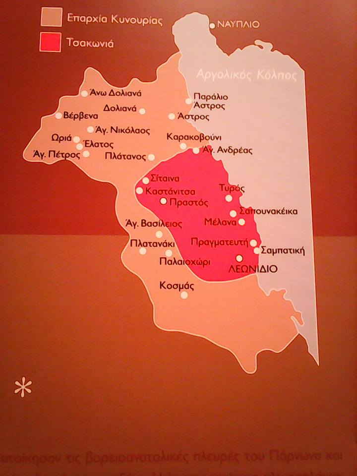Στην περιοχή της Τσακωνιάς, Πραστός(32 χλμ), Άγιος Ανδρέας, Καστάνιτσα (30 χλμ), Σίταινα (26 χλμ) και στο γειτονικό Δήμο Νότιας Κυνουρίας , Λεωνίδιο (50 χλμ) ,Τυρό (30 χλμ) και άλλα χωριά χρησιμοποιείται ακόμα και σήμερα η τσακώνικη διάλεκτος η οποία έχει ρίζες στην αρχαία Δωρική”. Οι Τσάκωνες συννεχίζουν και σήμερα να μιλάνε αρχαία Ελληνικά και “τα Τσακώνικα είναι η αρχαιότερη ζωντανή γλώσσα στην Ελλάδα. “