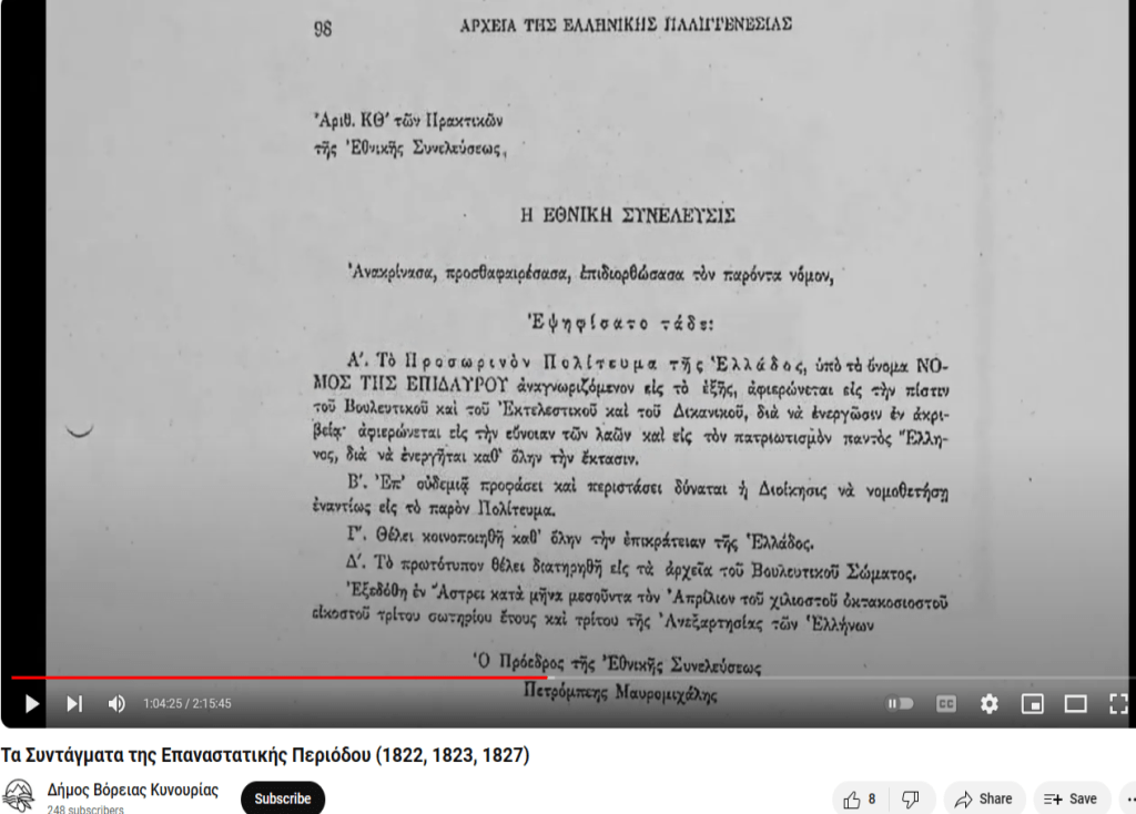 7. Βλ. αναλυτικά Α. Καϊδατζής, Ο Συνταγματισμός του Εικοσιένα: Η συνταγματική πρακτική της Επανάστασης μέσα από τις πηγές, 1821-1827, (εκδ. Ευρασία), Αθήνα, 199-266 καθώς και Ξ. Κοντιάδης, Η περιπετειώδης ιστορία των επαναστατικών συνταγμάτων του 1821: Η θεμελιωτική στιγμή της Ελληνικής Πολιτείας, Αθήνα, 2021: 117-134. Συνολικά και συνοπτικά για την περίοδο, βλ. N. C. Alivizatos, “Assemblies and Constitutions”, στο The Greek Revolution: A Critical Dictionary, P. M. Kitromilides και C. Tsoukalas επ., (εκδ. Harvard University Press), Cambridge Massachusetts, 439-452.