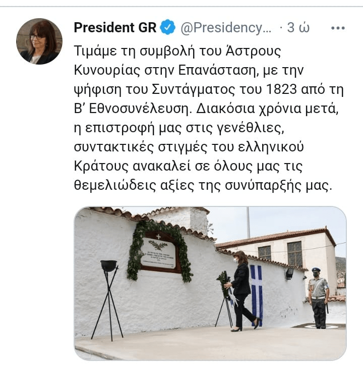 “Τρίτον ήδη χρόνον διαρκεί ο υπέρ ανεξαρτησίας εθνικός των Ελλήνων πόλεμος και ο τύραννος ούτε κατά γην ούτε κατά θάλασσαν ηυδοκίμησεν. Ενώ δε αι τυραννοκτόνοι χείρες των Ελλήνων έπεμψαν μυριάδας Τούρκους εις άδου, και φρούρια απέκτησαν, και την επικράτειαν εξησφάλισαν, ο δε κρότος των ημετέρων όπλων, αντηχήσας, διετάραξε το Βυζάντιον, ευτύχησε το έθνος να διακηρύξη εν Επιδαύρω κατά πρώτον ως έθνος, την ανεξαρτησίαν του, να νομοθετήση και εθνικήν να καταστήση διοίκησιν .