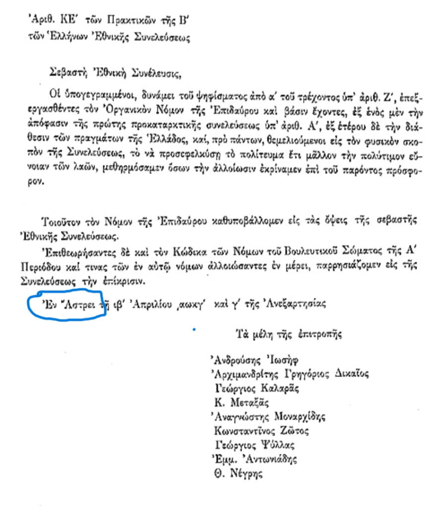 Αρχεία της Ελληνικής Παλλιγενεσίας .1823 Αριθ.ΚΘτωνΠρακτικώντηςΕθνικήςΣυνελεύσεως«B’. Επ’ ουδεμιά προφάσει και περιστάσει δύναται η Διοίκησις να νομοθετήση εναντίως εις το παρόν Πολίτευμα…ΕξεδόθηενΆστρει κατά μήνα μεσούντα τον Απρίλιον…»