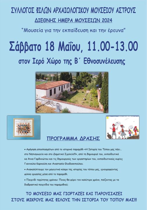“Ο Σύλλογος Φίλων Αρχαιολογικού Μουσείου Άστρους, στο πλαίσιο των δράσεών του και θέλοντας να φέρει σ’ επαφή τα παιδιά με την ιστορία και τα μνημεία της περιοχής που διαμένουν, διοργανώνει εκπαιδευτική δράση στον Ιερό Χώρο της Β΄ Εθνοσυνέλευσης.