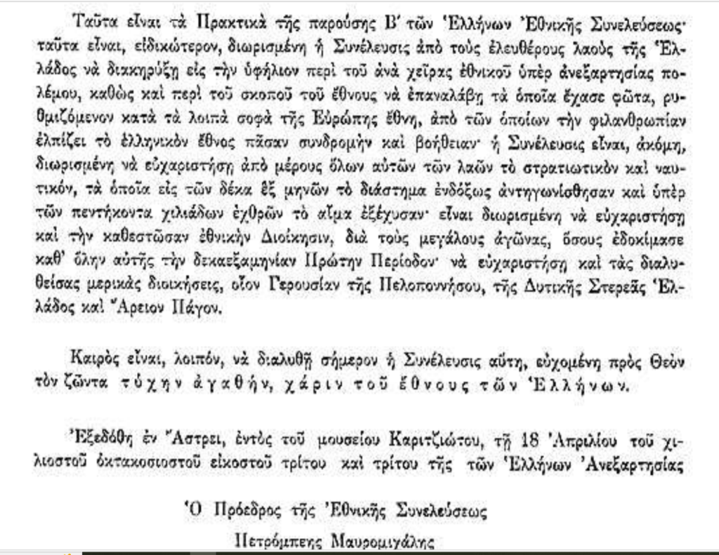 Καιρός είναι λοιπόν να διαλυθεί σήμερον η Συνέλευσις αύτη, ευχόμενη προς θεόν τον ζώντα τύχην αγαθήν χάριν του Έθνους των Ελλήνων.
