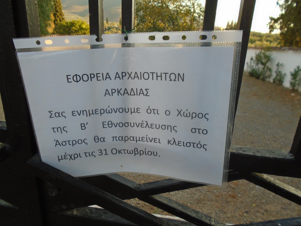 Τον Ιούλιο 2008, για λόγους ασφαλείας λόγω του σεισμού. αποφασίστηκε το κλείσιμο του Αρχαιολογικού Μουσείου Άστρους, αλλά από υπερβολική ταχύτητα και απερισκεψία , χωρίς απόφαση η ένα αιτιολογημένο έγγραφο από την αρμοδία αρχή του Υπουργείου Πολιτισμού, έκλεισε και ο γειτονικός “Ιερός Χώρος ” της Β’ Εθνοσυνέλευσης των Ελλήνων καιτο Προαύλιο της Σχολής Καρυτσιώτη (πάλι καλά που δεν έκλεισε και η γειτονική πλατεία Καρυτσιώτη) . Ένας υπάλληλος έκλεισε για σχεδόν δέκα χρόνια το “Ιερο Χώρο” γιατί πιθανόν θεωρούσε ότι με αυτό τον τρόπο πρόβαλλε καλύτερα την ποτιστική μας κληρονομιά . Ποιός αρμόδιος θα τολμούσε γραπτά και θεσμικά να αποφασίσει για να κλείσει τον «Ιερό Χώρο» και που θα έβρισκε έστω μια δικαιολογία για να αιτιολογήσει αυτή την απόφαση. O «Iερός Χώρος» της Β” Εθνοσυνέλευσης παρέμεινε κλειστός καταχρηστικά για πολλά χρόνια, χωρίς τις αρμόζουσες διαδικασίες και χωρίς την τήρηση και εφαρμογή των κανονισμών του Υπουργείου Πολιτισμού.