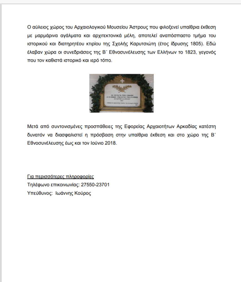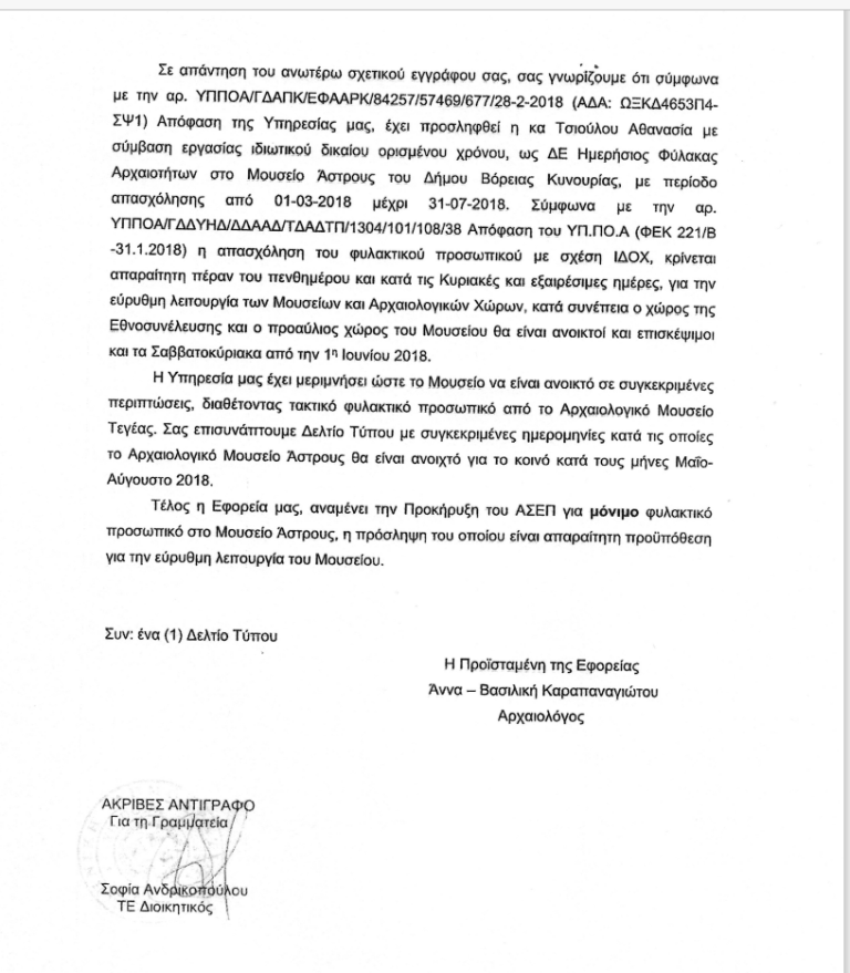 ΕΦΑΑΡΚ-Το αρ.ΥΠΠΟΑ/ΓΔΑΠΚ/ΕΦΑ ΑΡΚΑΔΙΑΣ /244604 /146538/2951-22/7/2016 έγγραφό μας, με το οποίο γνωρίζουμε στην Διεύθυνση Αναστήλωσης Βυζαντινών Μεταβυζαντινών Μνημείων, κατόπιν της αρ. ΥΠΠΟΤ/ΔΑΒΜΜ /91790 /2329 π.ε.-12.01.2011 Απόφασής της (ΑΔΑ: 4Α92Γ-99), την ολοκλήρωση των εγκριθεισών εργασιών μέσω της Προγραμματικής Σύμβασης Πολιτισμικής Ανάπτυξης για την εκτέλεση του έργου «Άρση Ετοιμορροπίας Αρχαιολογικού Μουσείου Άστρους Κυνουρίας» μεταξύ του τέως Υ.ΠΑΙ.Θ.Π.Α, της Περιφέρειας Πελοποννήσου και του Δ. Β. Κυνουρίας και ότι το Μουσείο είναι έτοιμο να επαναλειτουργήσει αλλά δεν υπάρχει μόνιμο φυλακτικό προσωπικό»