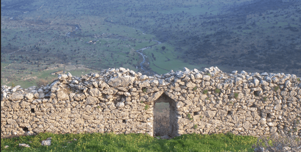 Η πόρτα του Κάστρου Εστέλλα στον Αγιάννη, στο βάθος διακρίνεται το Ξεροκάμπι του Αγιάννη , “πεδιάδα του Άσtρους” (Leake) , “του άστρου την περι τον κάμπον της μαλεβής“ (Βυζαντινός Αυτοκράτορας Ανδρόνικος Β’ Παλαιολόγος) .